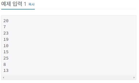 아홉 개의 줄에 걸쳐 난쟁이들의 키가 주어진다. 주어지는 키는 100을 넘지 않는 자연수이며, 아홉 난쟁이의 키는 모두 다르며, 가능한 정답이 여러 가지인 경우에는 아무거나 출력한다.