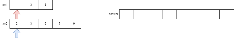 arr1의 위치를 기록할 변수를 p1, arr2의 위치를 기록할 변수를 p2라고 선언한 뒤 0으로 초기화한다.