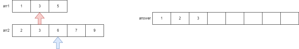 - 3과 2를 비교했을 때 2가 더 작기 때문에 answer에는 2가 추가되고 p2가 arr2의 다음 원소를 가리킨다.