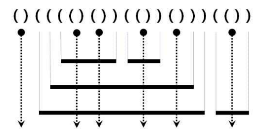 이 그림에서 레이저는 맞닿아있는 괄호들 () 이고 여는 괄호가 있으나 바로 뒤에 닿는 괄호가 나오지 않는 것들은 막대이다.