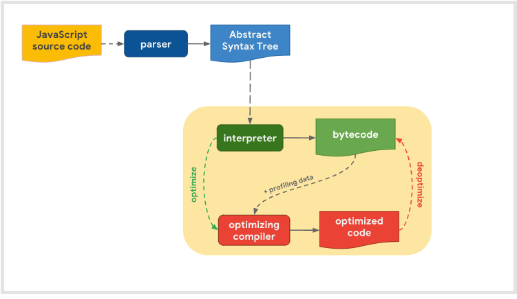 - 바이트코드는 자주 사용되는 함수 및 타입 정보 등이 있는 프로파일링 데이터(Profiling Data)와 함께 최적화 컴파일러(Optimizing Compiler)에게 보내진다.