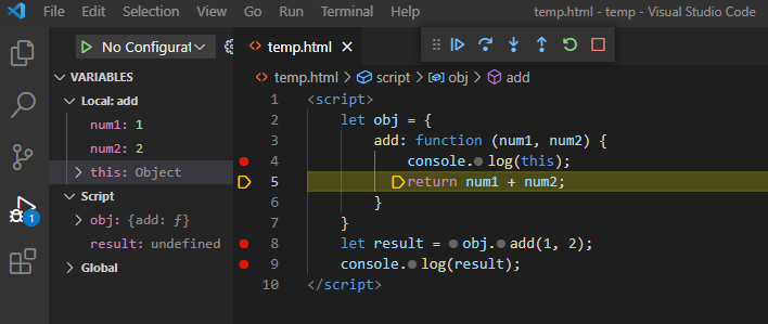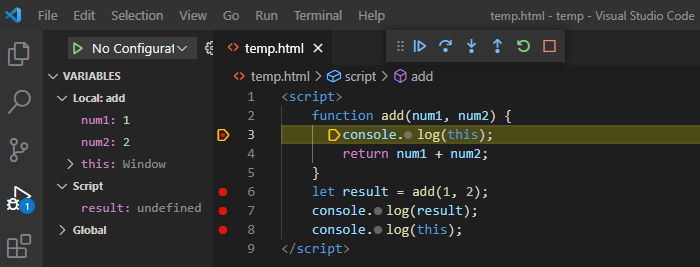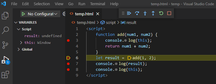 이때 함수 밖에서 this는 window 객체를 가리키고 있는 것과 Variables에 함수 밖에서 선언된 변수들의 현황이 들어가 있는 것을 확인할 수 있다.