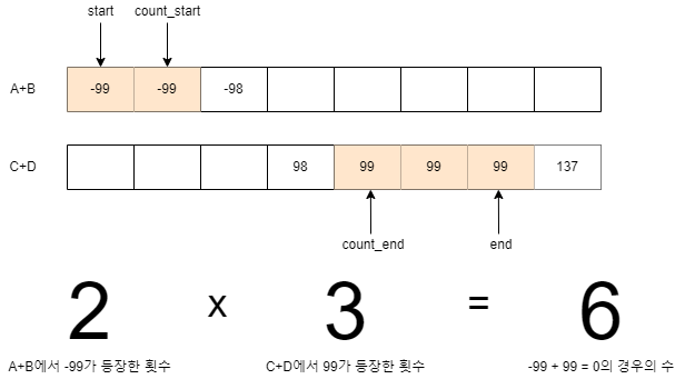 그리고 합이 0이 되는 횟수를 저장할 변수 count에 (AB[start]와 동일한 값이 등장한 횟수) * (CD[end]와 동일한 값이 등장한 횟수)를 더해준다.