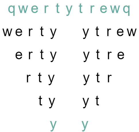 이를 구하기 위해서는 t부터 q까지 하나하나 반대로 원본 문자열인 qwerty에 붙여가며 비교해 보는 것이다.