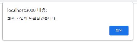 서버로부터 받은 응답의 상태에 따라 회원가입에 성공했다면 성공 메세지를 띄운 후 LoginPage로 보내는 작업을, 회원가입에 실패했다면 실패했다는 안내 메세지를 띄운다.